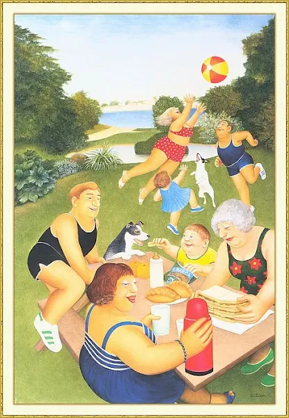Beryl Cook (10 de septiembre de 1926 - 28 de mayo de 2008), fue una artista británica reconocida por sus pinturas distintivas e inmediatamente reconocibles. Sus obras, a menudo impregnadas de humor, capturaron escenas de la vida cotidiana, retratando a personas que encontró en diversos entornos, como pubs, salidas de compras, despedidas de soltera, espectáculos de drag queens o reuniones familiares en la playa o en el extranjero. A pesar de carecer de formación formal, Cook no empezó a pintar hasta los treinta años. Se la conocía por ser reservada e introvertida, en contraste con los personajes extravagantes y extrovertidos que a menudo representaba en su arte.